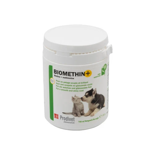 Hat Ihr Hund oder Ihre Katze ein stumpfes oder struppiges Fell? Dann können Sie ihm Biomethin+ geben. Das Pulver enthält unter anderem Glucose, Laktose und Biotin. Diese Inhaltsstoffe unterstützen die Fellkondition und machen es weich und glänzend. Die Ergänzung wird im 100-Gramm-Topf geliefert. Biomin+ kann einen Zeitraum von 4 bis 6 Wochen über das Trinkwasser oder Futter Ihres Tieres verabreicht werden.