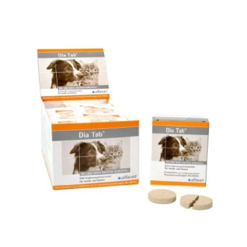 Dia Tab (Diatab) Kautabletten sind ein Futterergänzungsmittel für Katzen und Hunde bestimmt, die Probleme mit der Verdauung oder mit dem Darm haben. Sie beinhalten pflanzliche Inhaltsstoffe, wie Süßholz, Heidelbeeren oder Fenchel. Diese Bestandteile können die Symptome von Durchfall lindern und somit Ihrem geliebten Haustier Linderung verschaffen. Durch die Einnahme dieser Tabletten kann die Konsistenz des Kots verbessert werden, womit sich die Verdauung verbessern kann und der Stoffwechsel angeregt wird. Damit wird der natürliche Verdauungsprozess stimuliert.