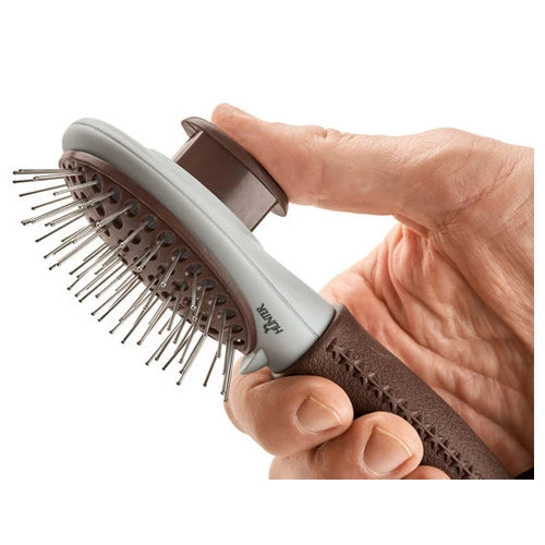 Nach dem gründlichen Striegeln des Hundes hält man oft eine Bürste voller Haare in der Hand – und diese müssen erst wieder mühselig mit den Fingern heraus gepflückt werden. Hier schafft die selbstreinigende Pflegebürste Spa von Hunter Abhilfe! Auf Knopfdruck werden die Haare ausgeworfen und ist die Hundebürste gereinigt. Sie verfügt über abgerundete Edelstahlborsten, die das Fell gründlich kämmen, entfilzen und von losen Haare befreien.