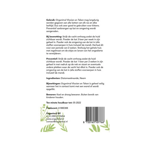 Organimal Flöhe und Zecken für Katzen ist ein natürliches Pulver zur Vorbeugung gegen verschiedene Parasiten, wie Flöhe, Zecken und Läuse. Es enthält Kieselgur und Neem.