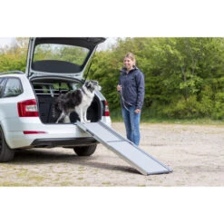 Diese Teleskop-Rampe von Trixie ist robust und fĂĽr groĂźe Hunde geeignet.